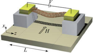 A suspended carbon nanotube can be made to vibrate like a guitar string. Gustav Sonne has studied how these oscillations influence the properties of the system if a magnetic field (H) is used to couple the mechanical motion of the tube to the ele-ctric current through it. (Credit: Image courtesy of University of Gothenburg)