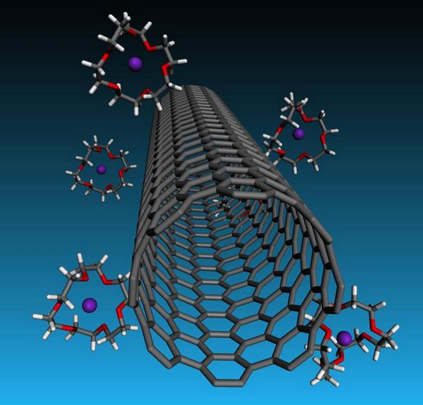 That took the addition of ether molecules known as 18-crown-6 for their crown-like atomic arrangements. The crowns have a particular appetite for potassium; they strip the remaining ions from the nanotube walls and sequester them. The tubes repulsive qualities become greater and allow for more nanotubes in a solution before van der Waals forces them to coagulate.