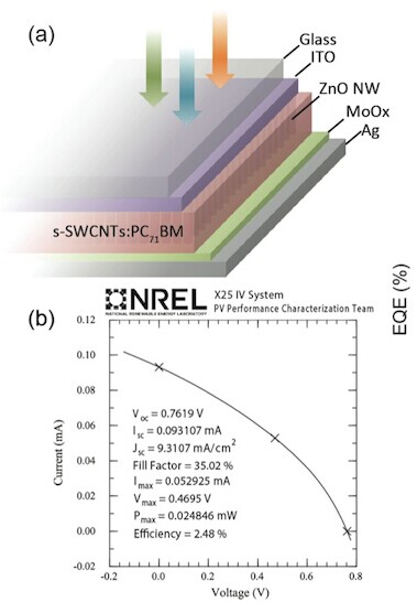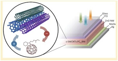 Although single-walled carbon nanotubes are ideal for TFPVs because they absorb light over a wide range of wavelengths from the visible to the near-infrared and possess charge carriers (electrons and holes) that move quickly, most TFPVs containing SWCNTs so far have suffered from limited current and voltage, and thus poor power conversion efficiencies.