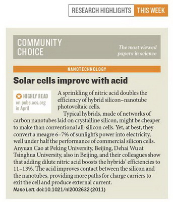 北京大學工學院曹安源課題組與清華大學機械系吳德海/王昆林教授課題組合作,進行“高效率碳納米管-晶體硅雜化太陽電池”研究,相關研究論文“Achieving High Efficiency Silicon-Carbon Nanotube Heterojunction Solar Cells by Acid Doping”今年5月份發(fā)表于Nano Letters (Y. Jia, A. Cao, D. Wu, et al. Nano Letters 2011, 11, 1901-1905)。5月18日的Nature雜志對此工作做了評論“酸處理提高了碳納米管-硅太陽電池的性能,可能比傳統硅基電池更便宜”。