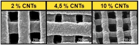 “尋找的合適粘度,使其既能夠通過(guò)注射器,同時(shí)又能保持足夠的牢固性,以在室溫狀態(tài)下獲得3D打印的支架,是相當(dāng)復(fù)雜的。”Mercedes承認(rèn),“而且,一旦PCL和羥基磷灰石混合在一起,再加入CNT并使它們適當(dāng)?shù)姆稚⑿枰L(zhǎng)時(shí)間的攪拌。”