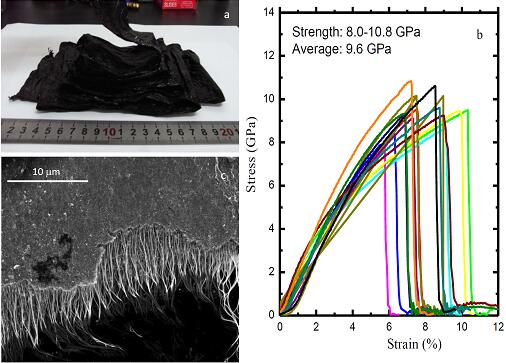 針對(duì)上述問(wèn)題,王健農(nóng)教授課題組創(chuàng)新性地利用浮動(dòng)化學(xué)氣相沉積法連續(xù)制備出CNT宏觀筒狀物,并在開(kāi)放大氣環(huán)境下將筒狀物直接沉積在滾筒上,制備得到大面積CNT薄膜。通過(guò)滾筒對(duì)筒狀物的牽引來(lái)提高薄膜的取向性,然后采用機(jī)械輥壓工藝提高薄膜的致密性,成功制備出高強(qiáng)度(9.6 GPa)、高楊氏模量 (130 GPa)和高延伸率(8%)的CNT薄膜材料。其抗拉強(qiáng)度值遠(yuǎn)遠(yuǎn)高于已報(bào)道的CNT及其它人造纖維和薄膜的強(qiáng)度值,在航空航天等高端領(lǐng)域具有重要應(yīng)用。