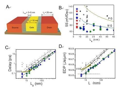 圖3: 碳納米管CMOS器件與傳統(tǒng)半導(dǎo)體器件的比較。A: 基于碳管陣列的場效應(yīng)晶體管結(jié)構(gòu)示意圖;B-D:碳管CMOS器件(藍(lán)色、紅色和橄欖色的星號)與傳統(tǒng)材料晶體管的亞閾值擺幅(SS),本征門延時和能量延時積的比較。