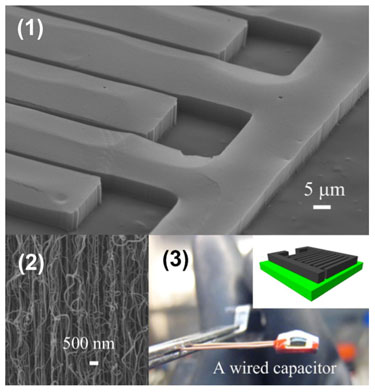 Interdigitated microelectrode designs have been widely employed in electrochemical sensors. Decreasing the dimensions of the electrode and interelectrode gap shortens the response time of the device and enhances its cycling efficiency. These two attributes are desirable in the field of ultracapacitors (or supercapacitors), where power is often restricted by the widely distributed resistances that go hand-in-hand with the large capacitance. Carbon nanotubes (CNT) of one-dimensional conductivity are generally considered as model materials for this capacitor.