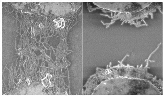 When depositing material from a surfactant-containing solution, the CNTs tend to cover the edges of metallic electrodes, which makes this approach more suitable for applications involving dense nanotube patterns. On the other hand, avoiding surfactants and, instead, functionalizing the nanotubes to disperse them in the solution might be more appropriate for making electronic and photonic devices because in this case the CNTs bridge the electrodes more effectively.