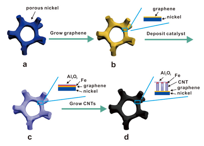 James Tour and colleagues may now have found a way around this problem. The researchers used methane as the carbon source to grow few-layered graphene on porous nickel via chemical vapour deposition at 1000 °C. They then grew CNTs from this graphene using e-beam deposited Fe/Al2O3. The length of the CNT forests could be controlled by simply adjusting the growth time.
