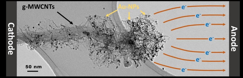 Such a graphene “canopy” on the top of the forest-like MWCNTs’ film provides a much higher density of electron-emitting sites under an applied electrical field. Taking advantage of the unique geometry of such a “graphene canopy”, they capitalize on their long expertise in pulsed laser deposition (PLD) of nanomaterials. They decorate these g-MWCNTs, in a second processing step, with gold nanoparticles (of 2–3 nm in diameter).
