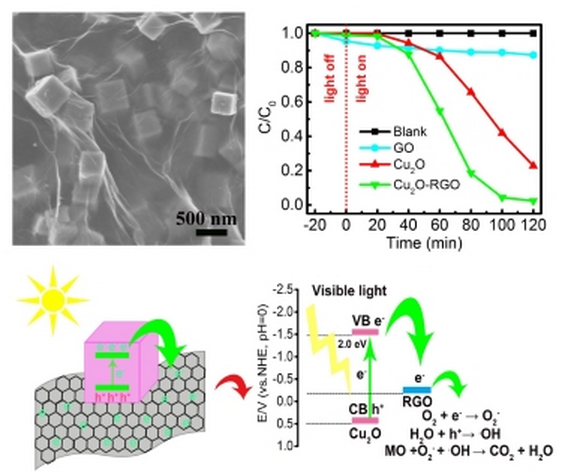 The electron-hole pairs generate on cubic Cu2O particles under visible light. The introduction of RGO enables excellent charge transport which contributes to the effective separation of electrons and holes. Scavengers are introduced and h+ and O2- radicals are proved to be the prime reactive species in the photocatalytic process.