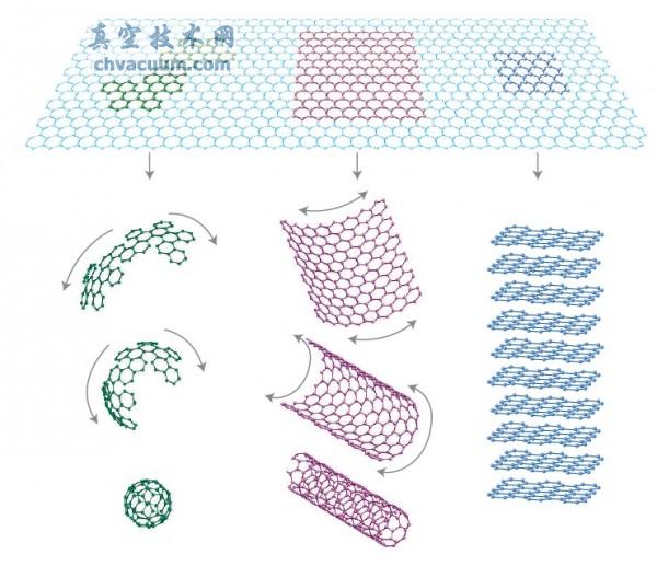 富勒烯(左)和碳納米管(中)都可以看作是由單層的石墨烯通過某種方式卷成的,而石墨(右)是由多層石墨烯通過范德華力的聯(lián)系堆疊成的。
