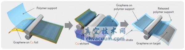韓國三星公司和成均館大學(xué)的研究人員利用化學(xué)氣相沉積的方法獲得了對角長度為30英寸的石墨烯,并將其轉(zhuǎn)移到188微米厚的聚對苯二甲酸乙二酯(Polyethylene terephthalate,簡稱PET)薄膜上,進(jìn)而制造出了以石墨烯為基礎(chǔ)的觸摸屏[4]。如下圖所示,生長在銅箔上的石墨烯先和熱剝離型膠帶(藍(lán)色透明部分)粘在一起,然后用化學(xué)的方法把銅箔溶解掉,最后用加熱的方法把石墨烯轉(zhuǎn)移到PET薄膜上去。