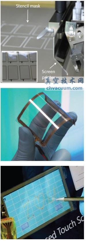 從上到下:在石墨烯上印好的銀電極把材料分成大小為3.1英寸的區(qū)域;組裝好的石墨烯觸摸屏面板;接到電腦上使用的石墨烯觸摸屏。