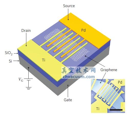 石墨烯光電感應(yīng)設(shè)備的示意圖和實(shí)際樣品的掃描電子顯微鏡(SEM)照片。圖中的黑色短線對應(yīng)5個(gè)微米,金屬線之間的距離是一個(gè)微米。