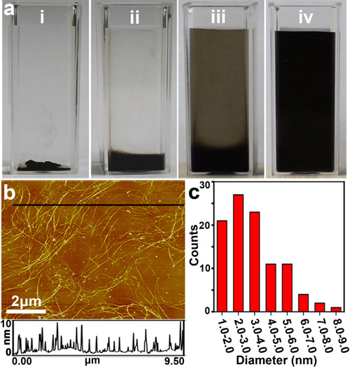 a: 單壁碳納米管在水中自發(fā)分散i) 0min,ii) 10min,iii) 1h,iv) 48h的照片;b: a圖中iv)的原子力顯微鏡照片;c: 單壁碳納米管管束大小的統(tǒng)計(jì)圖,顯示分散液中的單壁碳納米管大多以單根或小管束的形式存在。