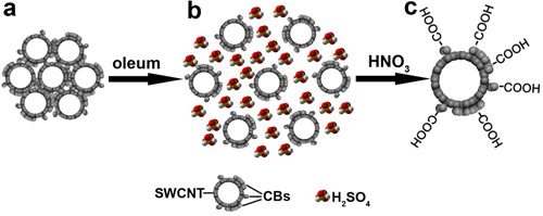 a: 單壁碳納米管(SWCNT)束;b: 發(fā)煙硫酸插層溶脹的單壁碳納米管束;c: 碳質(zhì)副產(chǎn)物(CBs)選擇性功能化后可自發(fā)分散的單壁碳納米管。