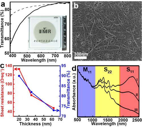 a: 薄膜的透射光譜,(插圖)薄膜的宏觀照片;b: 薄膜的掃描照片;c: 薄膜透明導(dǎo)電性能隨其厚度的變化曲線;d: 薄膜的吸收光譜。