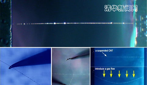 為攻克這個(gè)技術(shù)難關(guān),清華大學(xué)化工系與微納米力學(xué)與交叉學(xué)科研究中心(CNMM)的研究團(tuán)隊(duì)先在硅片(帶刻槽)上生長(zhǎng)密度較低的20-50cm的超長(zhǎng)碳納米管,然后控制四氯化鈦在空氣(含微量水蒸汽)中水解,從而在碳納米管表面沉積數(shù)十至數(shù)百納米大的二氧化鈦顆粒。這些顆粒對(duì)可見光有很強(qiáng)的散射能力(遵循米氏散射),使單根碳納米管在光學(xué)顯微鏡下能夠被清晰地觀察并準(zhǔn)確定位,并可進(jìn)行單根碳納米管的任意拉伸、剪切、轉(zhuǎn)移等各種操縱控制。該沉積方法不需要復(fù)雜設(shè)備,只需要幾秒鐘就可完成,簡(jiǎn)單高效,大大提高了碳納米管的結(jié)構(gòu)表征、性能測(cè)量以及器件構(gòu)建效率。