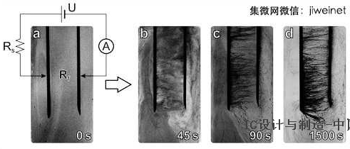 首先是結(jié)合一個高電壓源(V)來驅(qū)動標準的固定電阻(Rs),他們以連續(xù)建構(gòu)了內(nèi)含懸浮碳奈米管、裝滿流體的容器,具備電阻Rf;而電路中的電流就是I=V/(Rs+Rf)。他們在這個實驗設定中觀察到的現(xiàn)象,是自組裝的碳奈米管云狀物,讓流體變得更容易導電。