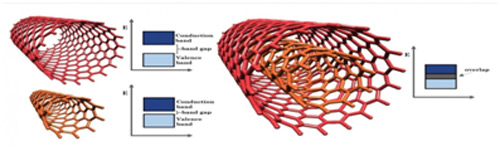 通過進(jìn)一步了解,他們發(fā)現(xiàn)纏繞有金屬的半導(dǎo)體納米管和易導(dǎo)電納米管可以有效地調(diào)整帶隙,而帶隙決定了半導(dǎo)體的性能。