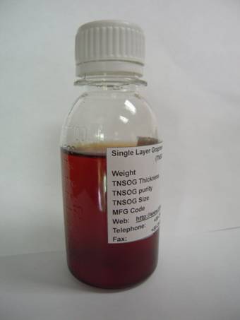 氧化石墨烯溶膠,顏色為棕紅色,溶劑為水,稀釋后顏色為金黃色。